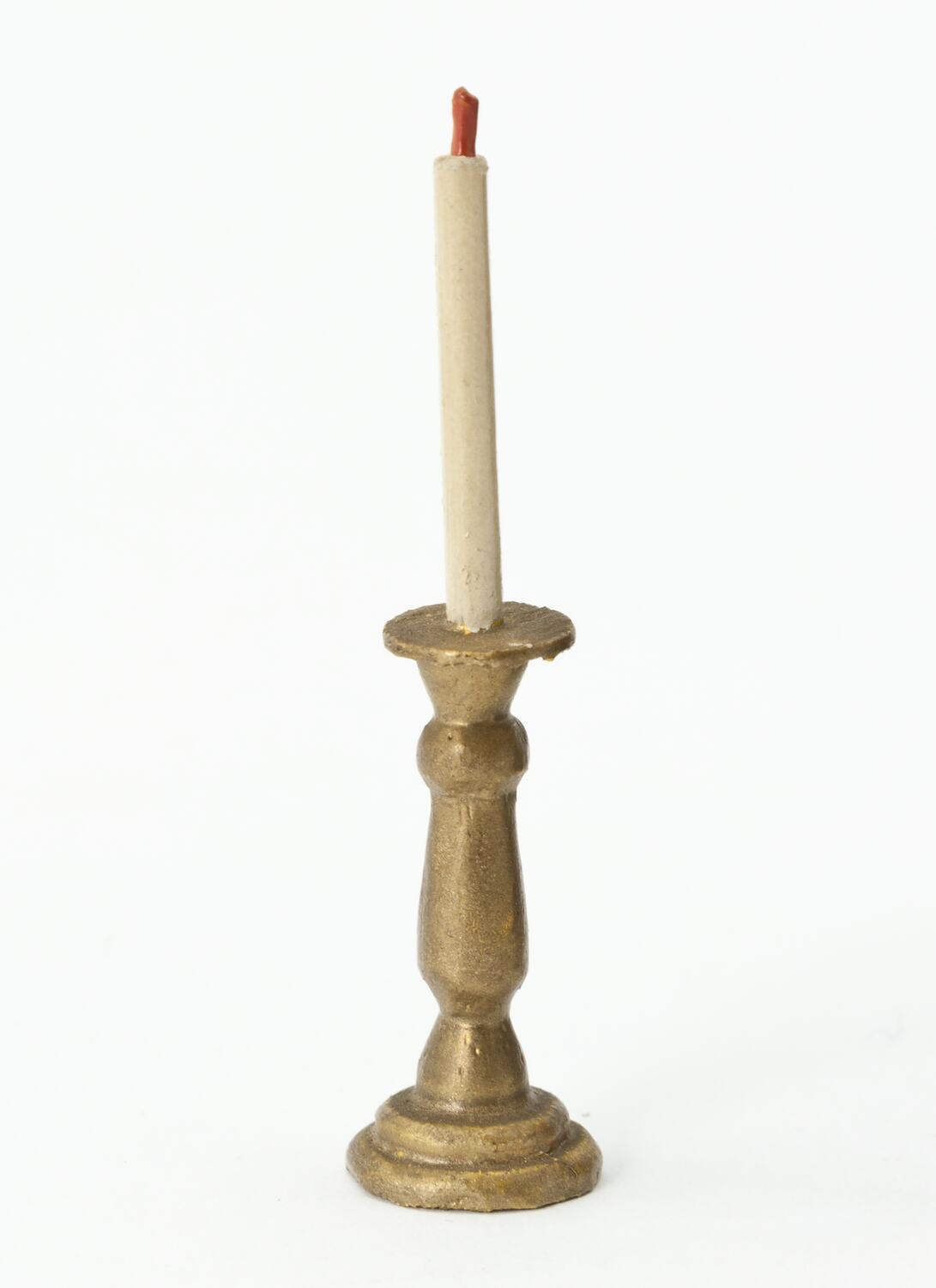 Turned wooden candlestick painted gold with a white taper candle with a red wick.