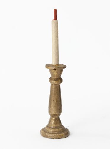 Turned wooden candlestick painted gold with a white taper candle with a red wick.