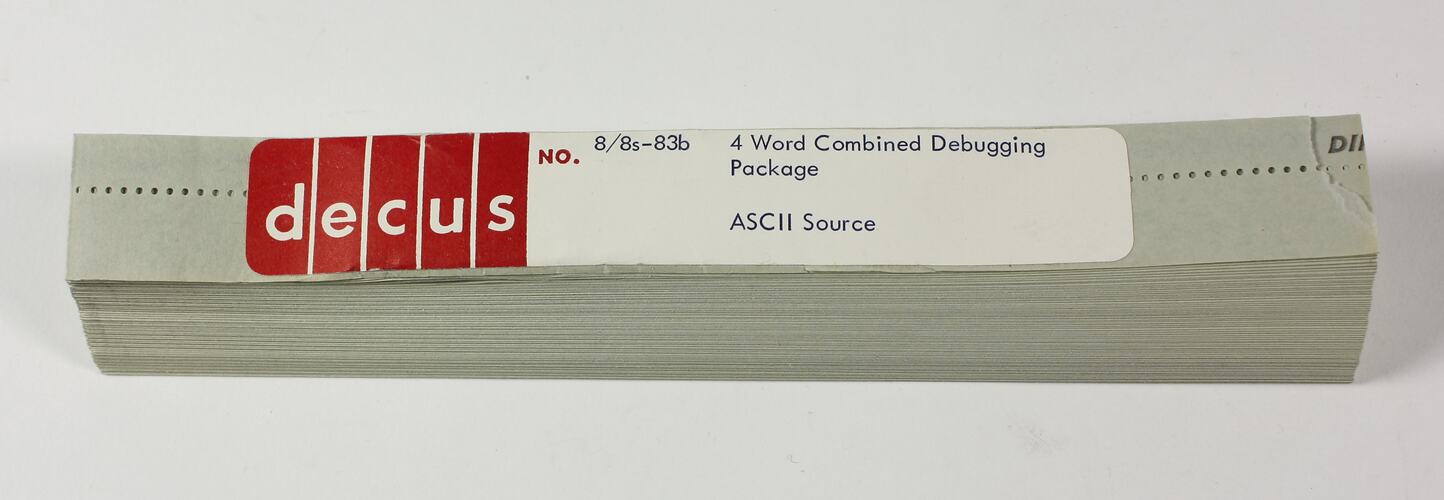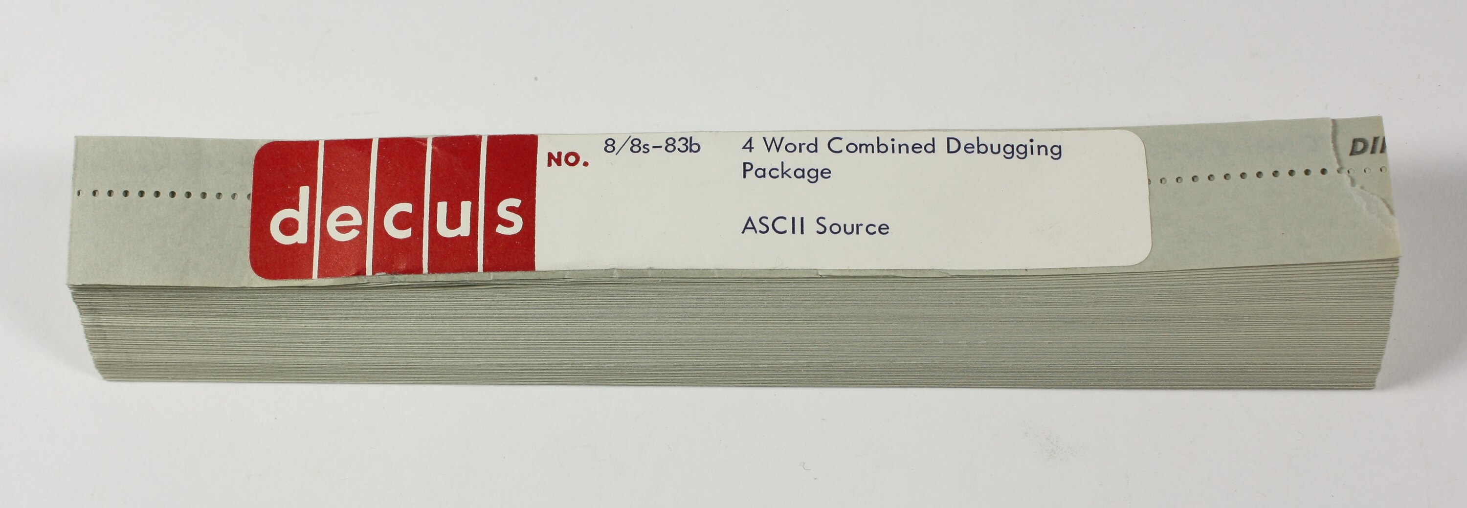Folded length of punched paper tape, titled '8/8s-83b 4 Word Combined Debugging Package, ASCII Source'.