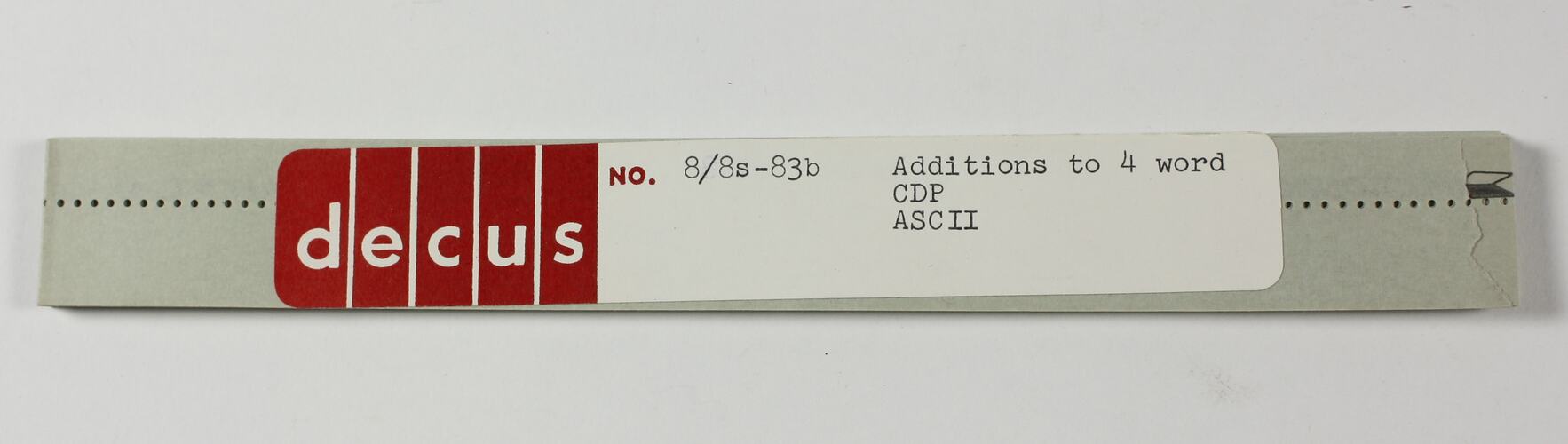 The punched paper tape is a software program for a PDP8 microcomputer. The program was prepared by DECUS (Digital Equipment Computer Users' Society), an independent user group founded in 1961. Paper tape was a reliable and inexpensive (although slow) method of loading and storing programs, prior to magnetic discs and tapes, and was still in use in the 1970s.