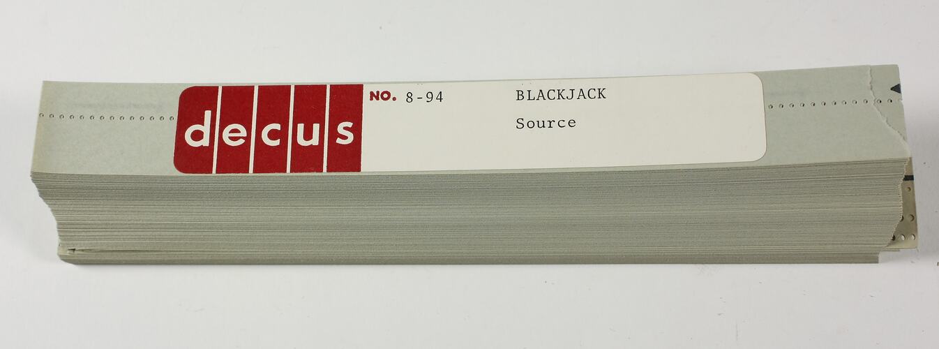 Folded length of punched paper tape, titled 'No. 8-94 Black Jack, Source'.