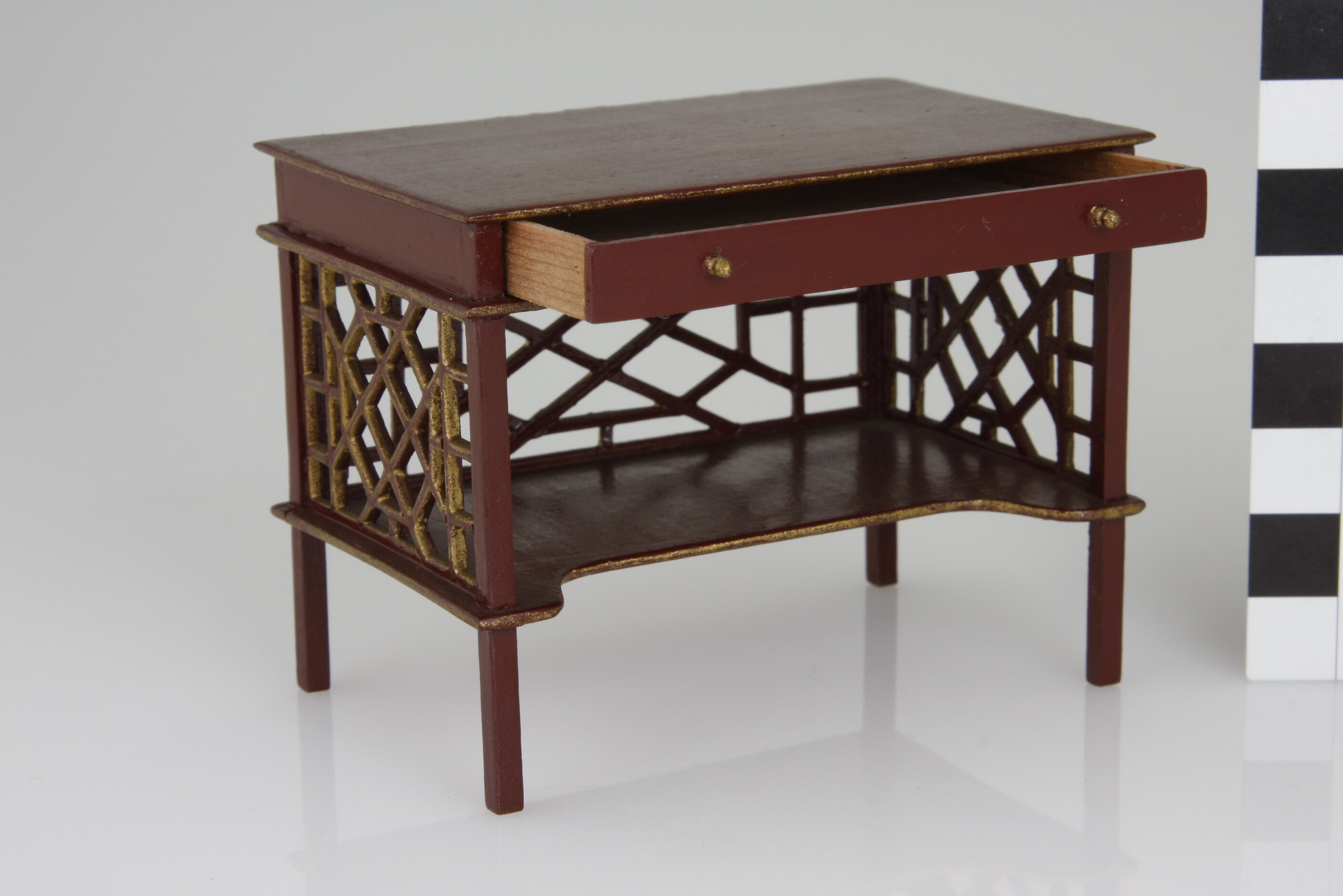 Dressing table is painted maroon and gold with maroon and gold fret work on three sides and one drawer across front.