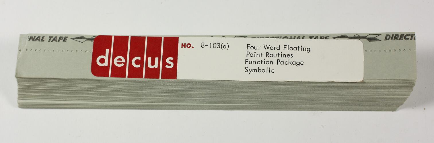 Folded length of punched paper tape, titled '8-103a Four Word Floating Point Routines, Function Package, Symbolic'.