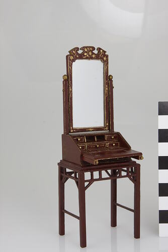 Combination vanity table and writing desk. Upper section is a small writing table with a front that opens and has five small drawers, two pigeon holes and a writing area with a large mirror at the back painted in maroon and gold with Chinese imagery. The lower section is a table that is also painted maroon and gold with some fret work around the upper sections.