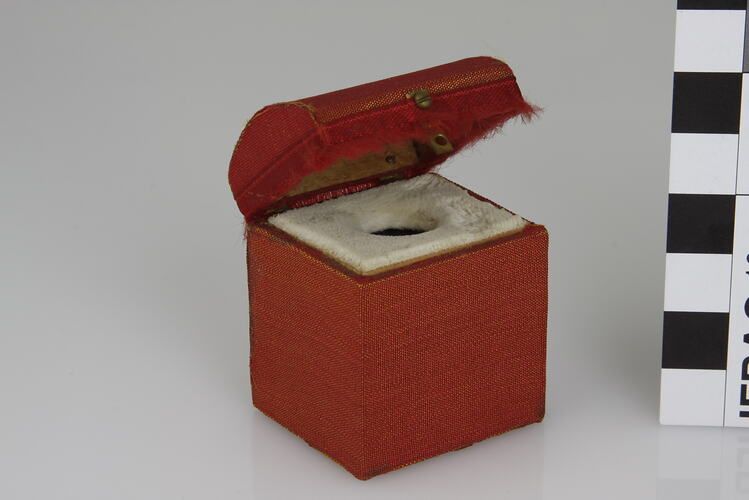 Commode has a curved, hinged lid and is covered with a reddish gold fabric. Inside is a cream velvet seat and a dark red glass chamber pot.