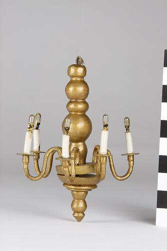 Turned, wooden six arm chandelier painted gold.