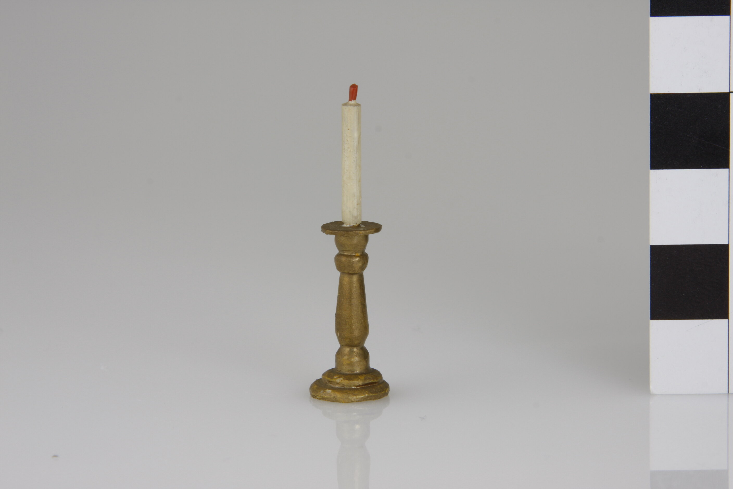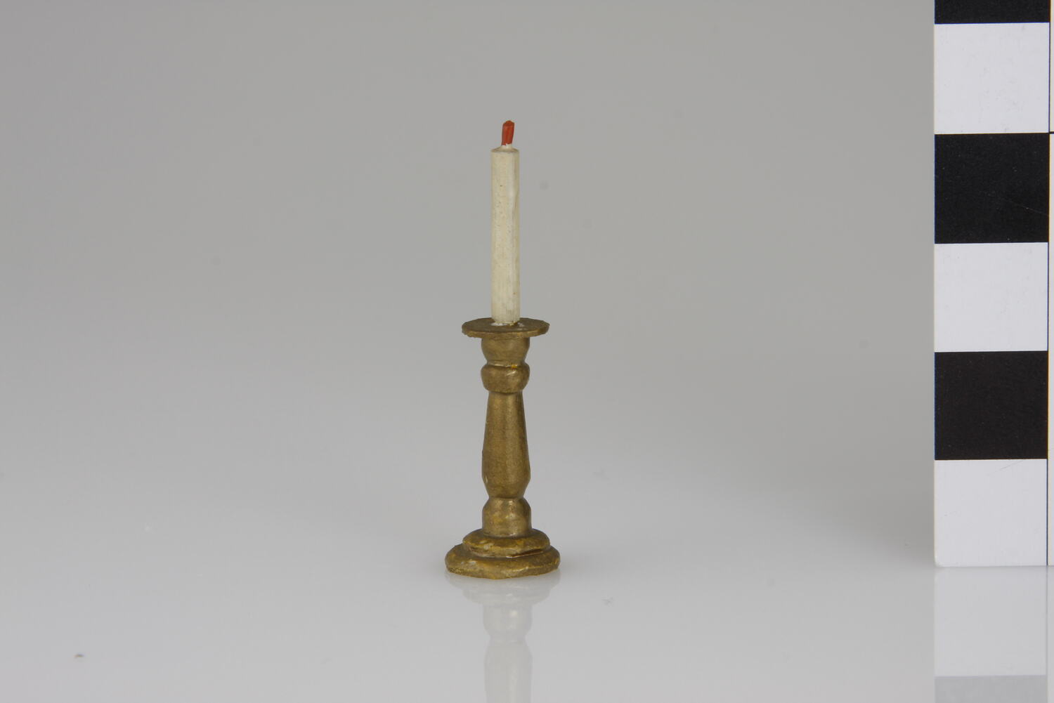 Turned wooden candlestick painted gold with a white taper candle with a red wick.