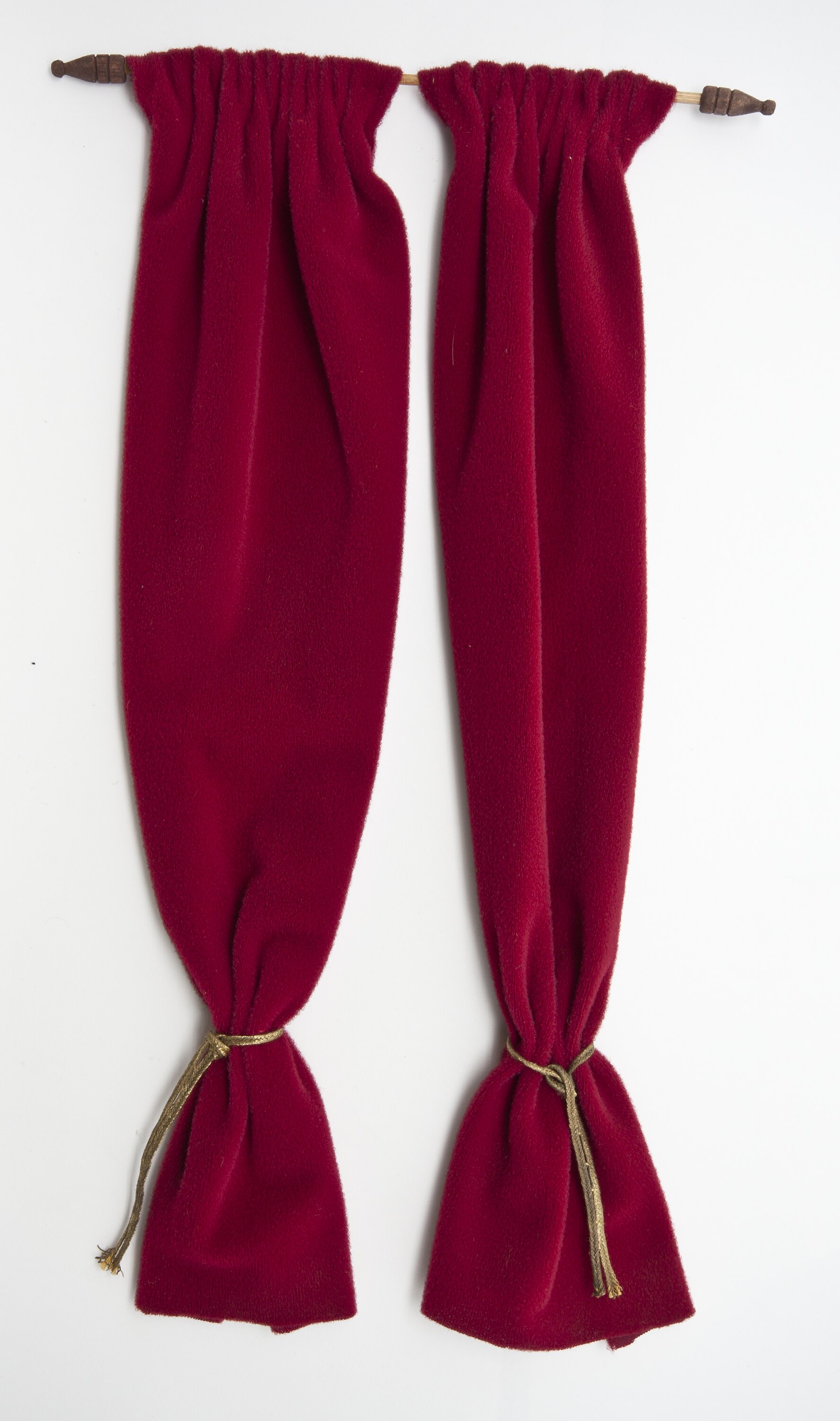 Pair of crimson velvet curtains. Curtains tied near ends with gold cord.