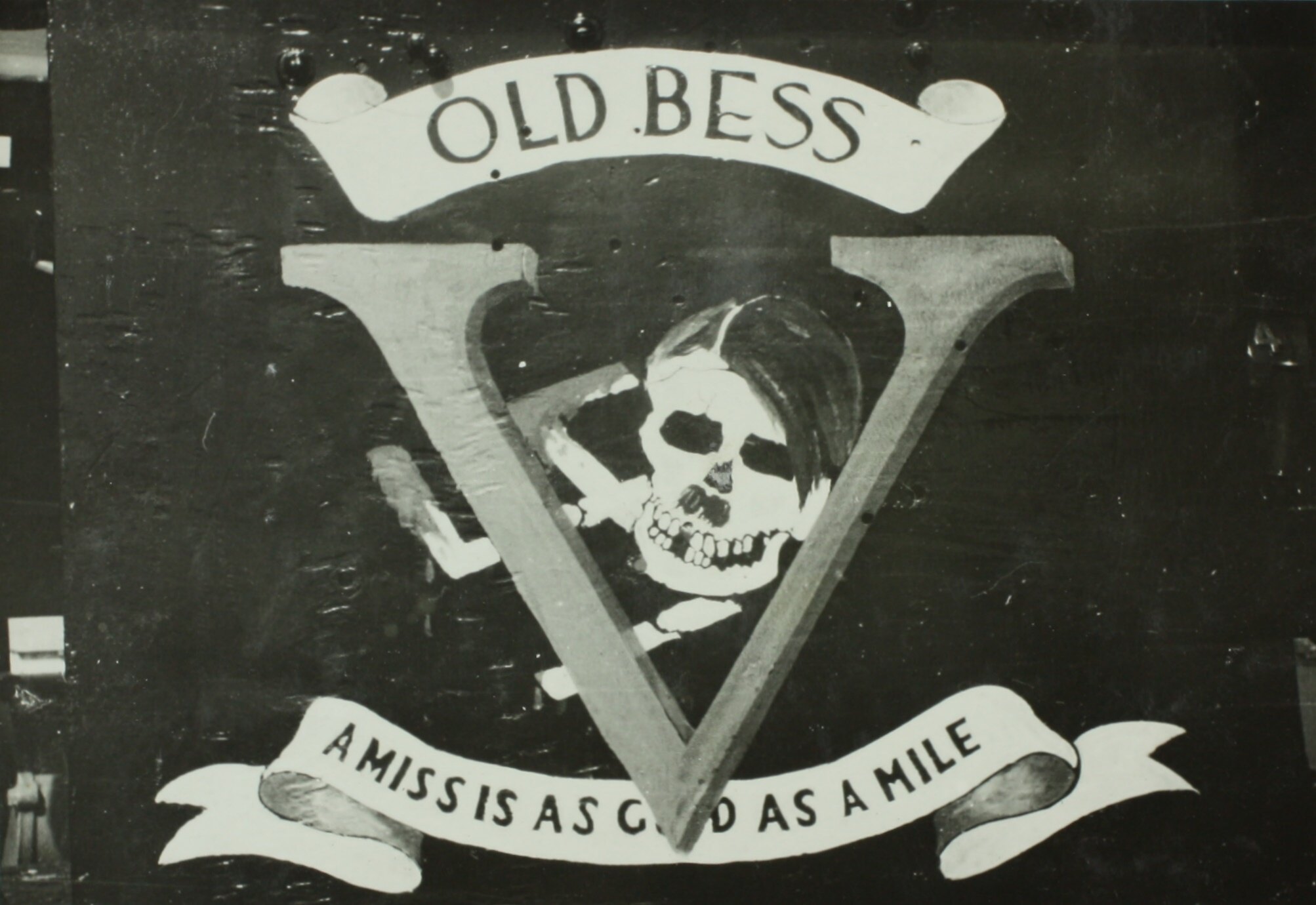 Image depicting Hitler as a skull, a swastika symbol, a large letter 'V' and inscription. The inscription reads "a miss is as good as a mile." This saying is thought to refer the fact that the margin of a miss doesn't matter: either you are still alive to carry out your mission or the enemy is and you have not done your job properly. It is unclear what "Old Bess" is referring too. "V" presumably stands for 'victory.'