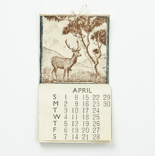 Undated calendar showing the month of April. Image at top of dates of a deer.