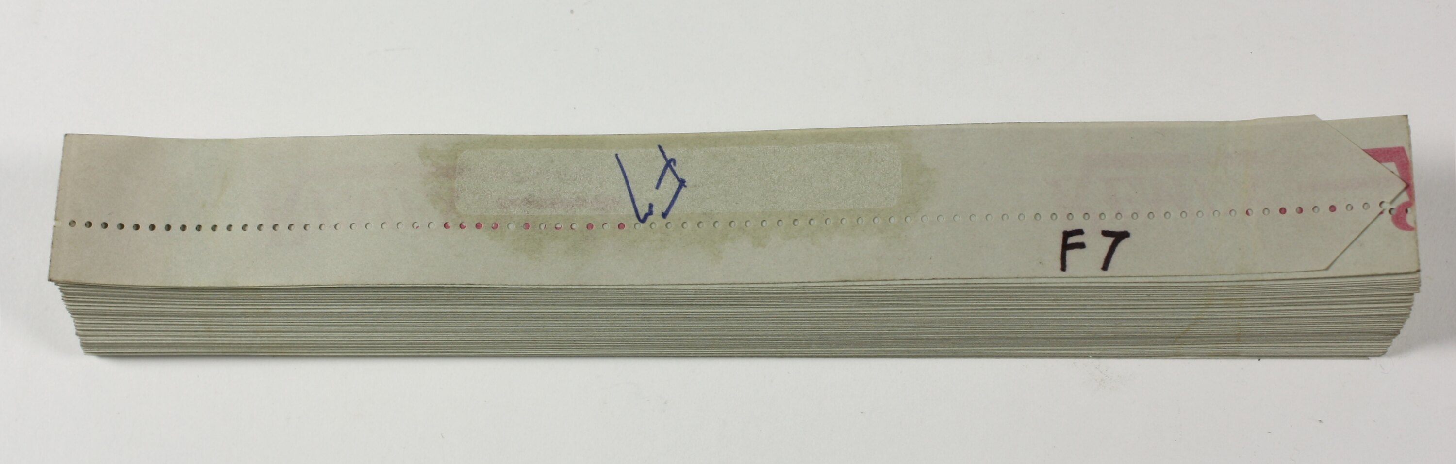 A length of grey paper tape folded like a fan with punched holes along its length. There are arrows and text printed in red ink along one side of the tape and handwritten text in black marker pen and blue ink.