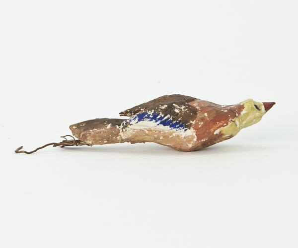 Hand painted wooden pheasant with a yellow head.