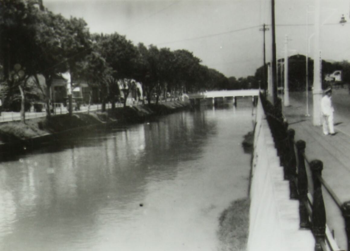 A canal is pictured in the centre of image. Trees are shown to the left of image and a man in uniform is standing in the street to the right.