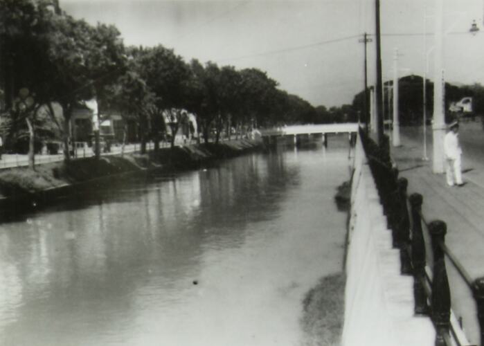 Handwritten in grey pencil on the back of photograph: 'Canal / (indecipherable) ananchy / Batavia' Handwritten in white ink underneath photograph: 'CANAL. / BATAVIA. / JAVA.'