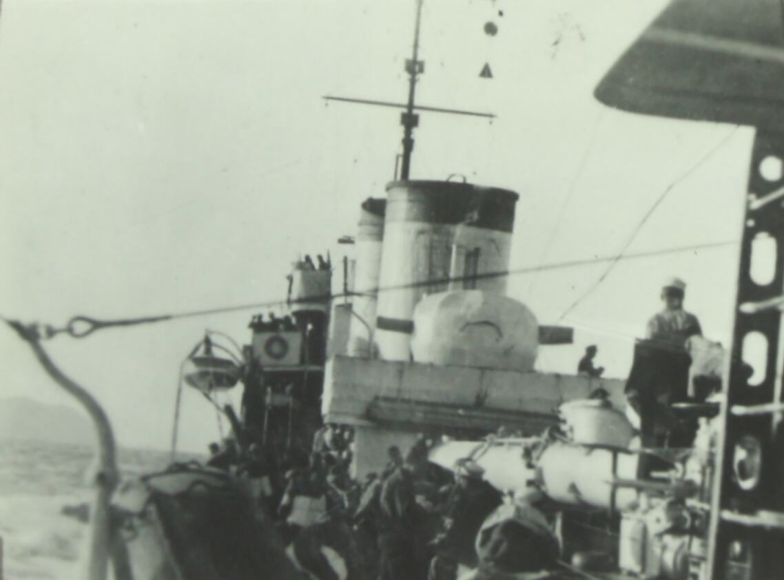 German troops are pictured on board an Italian destroyer. The ocean is pictured in the background.