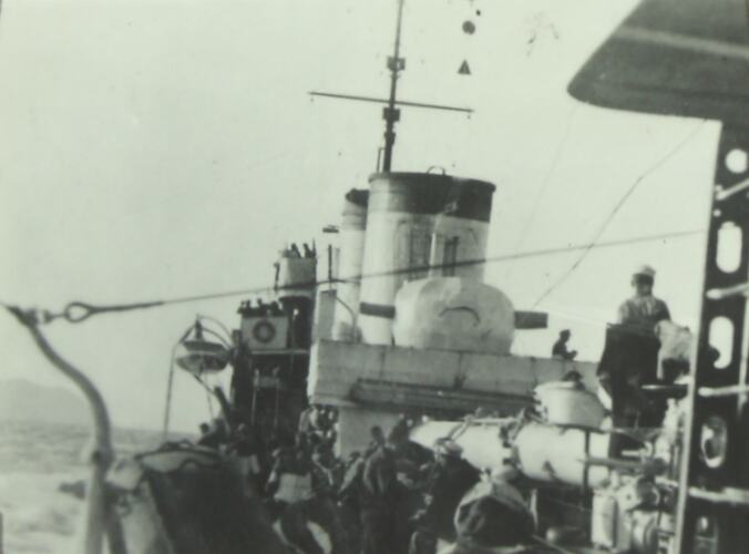 Handwritten in grey pencil on the back of photograph: 'Nazi Troop' Handwritten in white ink underneath photograph: 'NAZI TROOPS "GOING OVER" ONBOARD / ITALIAN DESTROYERS.' Printed in black ink on the back of photograph: 'SELO (repeated)'