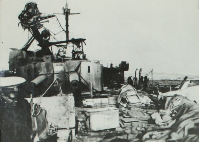 The Italian cruiser San Giorgio after bombing by the RAF in Tobruk harbour.