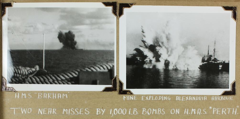 Handwritten in grey pencil on the back of photograph: 'Barham struck' Handwritten in white ink below photograph: 'H.M.A.S. "BARHAM". / TWO NEAR MISSES BY 1,000 LB. BOMBS ON H.M.A.S. "PERTH".'