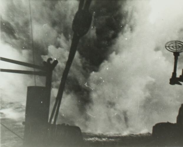 Image depicting a near miss on the HMAS Perth in the harbour of Alexandria, the HMAS Perth had travelled to Alexandria after evacuating troops from Crete following the Battle of Crete.