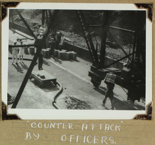 Handwritten in grey pencil on the back of photograph: 'Counter / Attack' Handwritten in white and ink below photograph: '"COUNTER ATTACK" / BY OFFICERS. / SAILORS WITH LOOTED SEWING / MACHINES AT SINGAPORE A FEW DAYS / BEFORE IS FEEL'