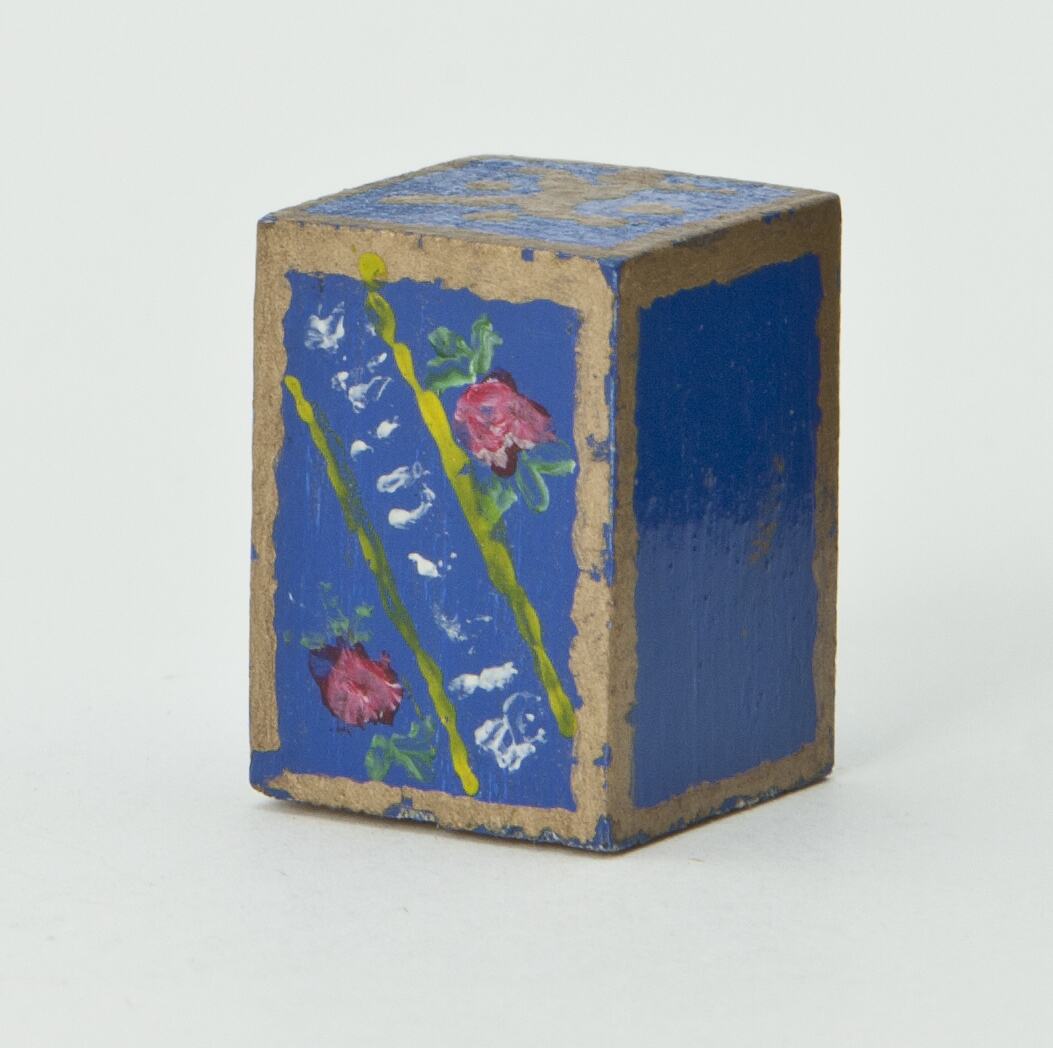 Rectangular wooden box painted blue with gold edges. Pink flowers painted on one side and text in white.