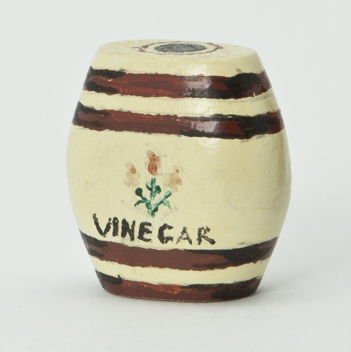 Vinegar jar painted cream with dark brown bands at top and bottom. Flowers painted in centre.