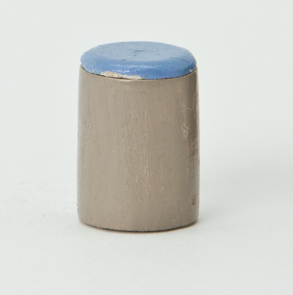 Round of cheese. Beige body with blue top and black text.