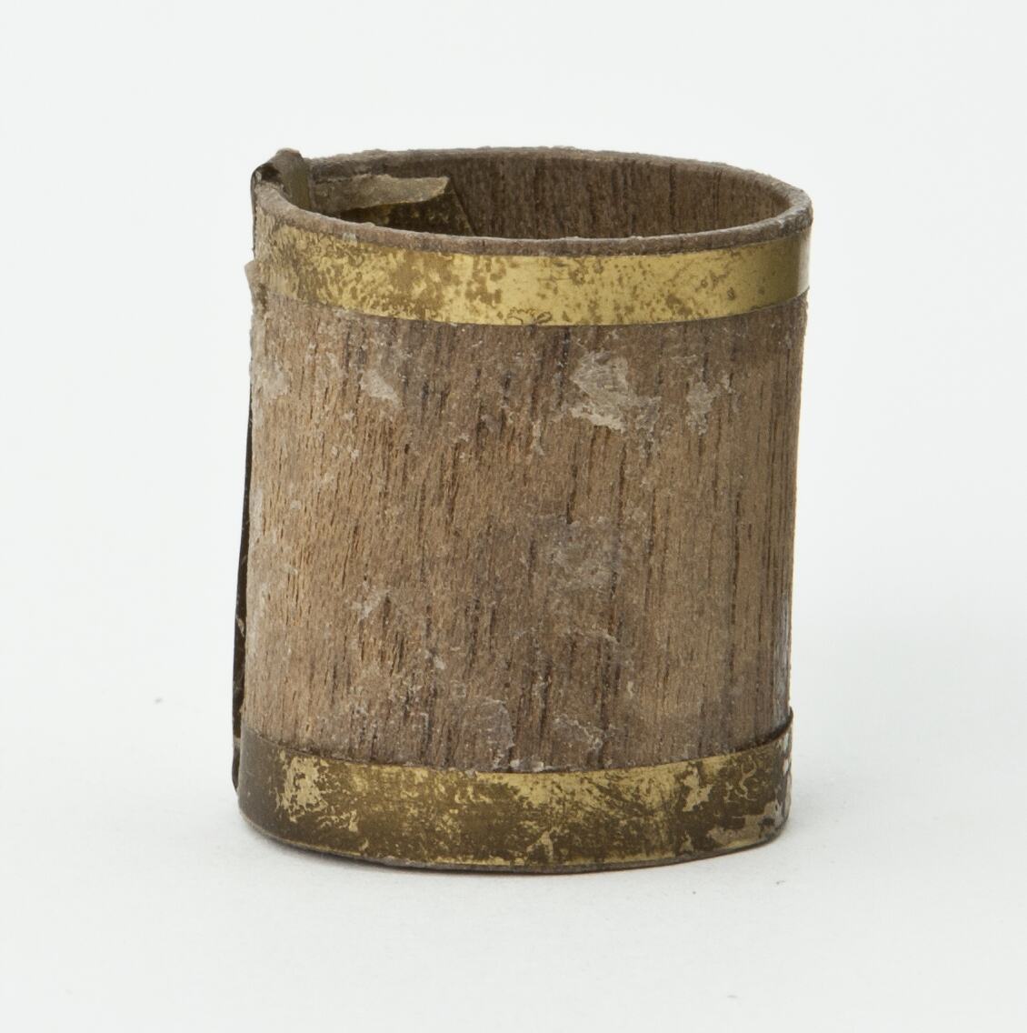 Round wooden bucket with metal bands around top and base. No handle.