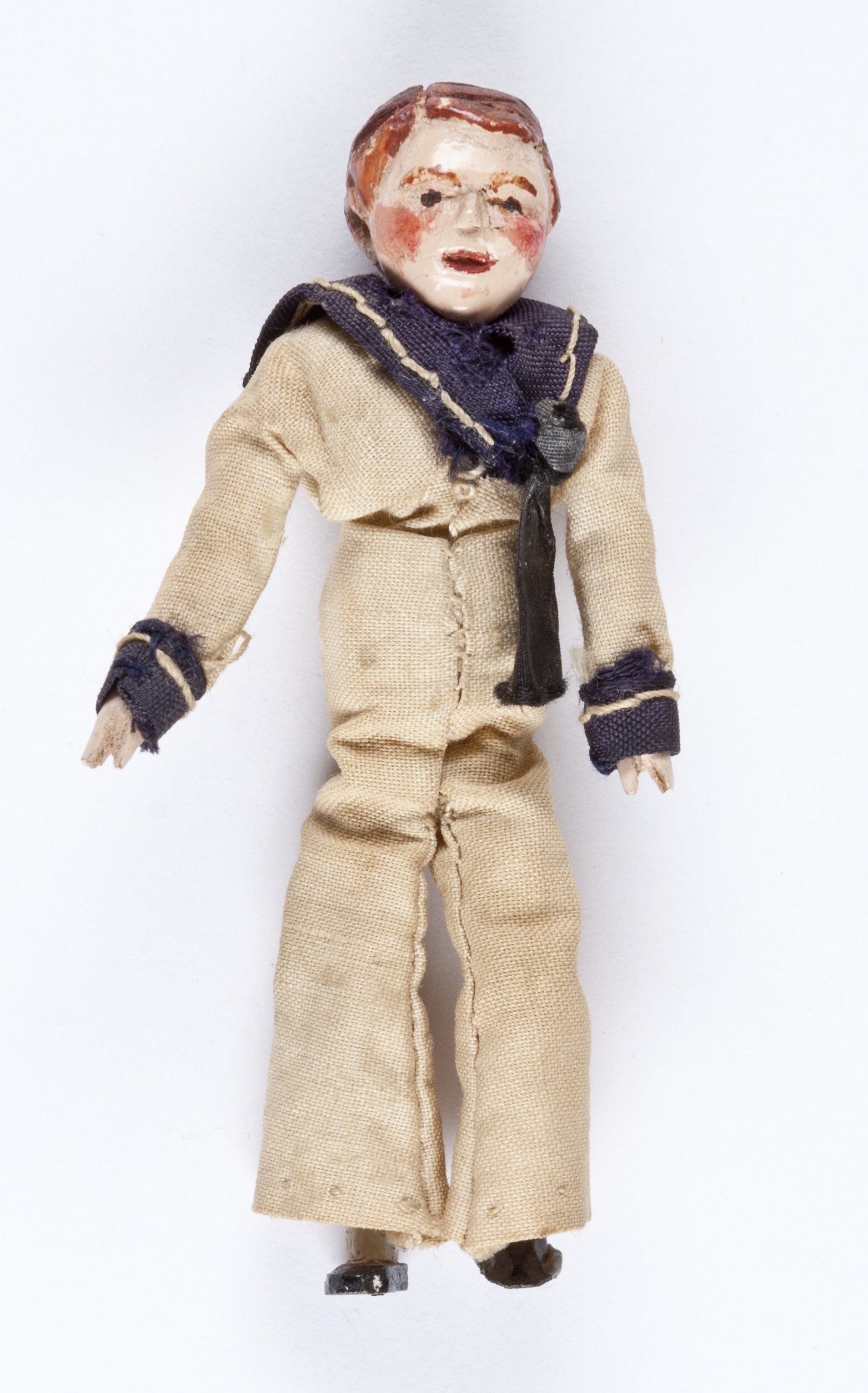 Handmade, hand painted wooden male doll with articulated joints. Doll is wearing a cream outfit with navy blue collar and cuffs like a sailor suit.