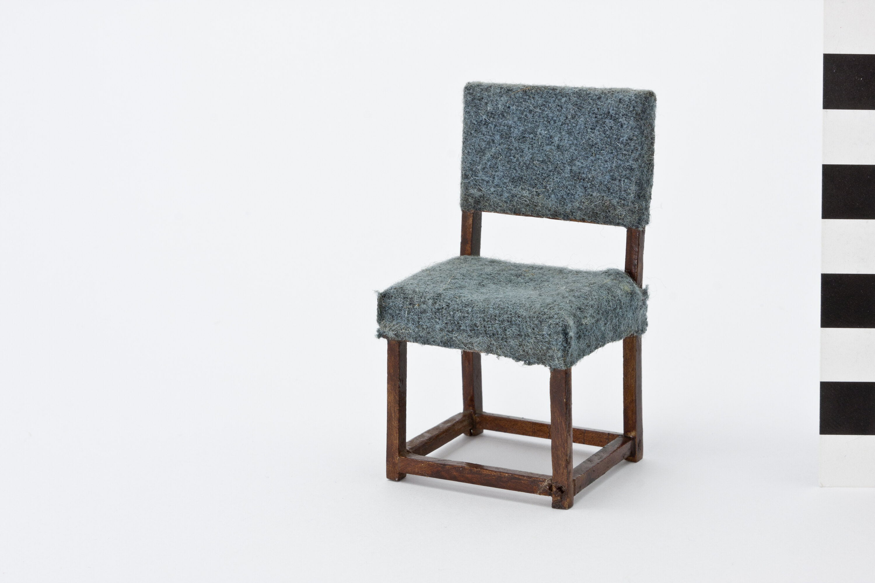 Handmade wooden chair upholstered back and seat with blue fabric.