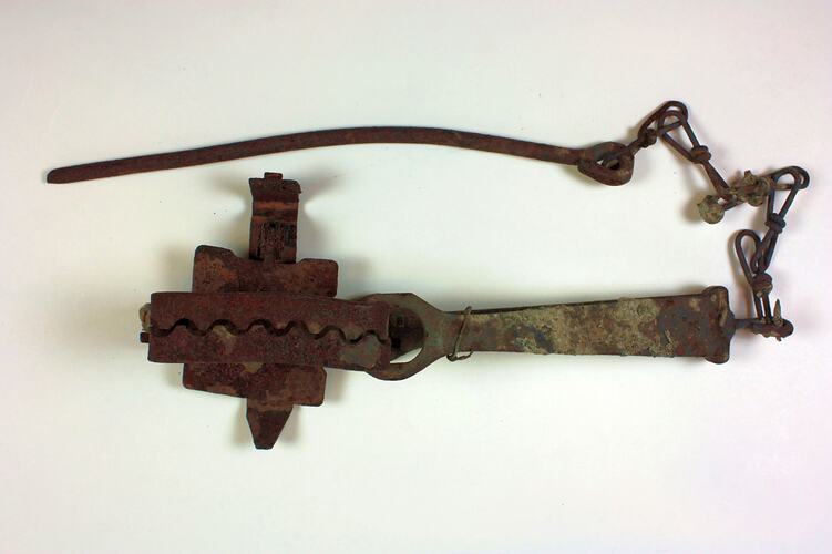 Steel rabbit trap, burned and rusted, with accretions from another object on upper face. A long chain attached to a stake was used to fix the trap to the ground.