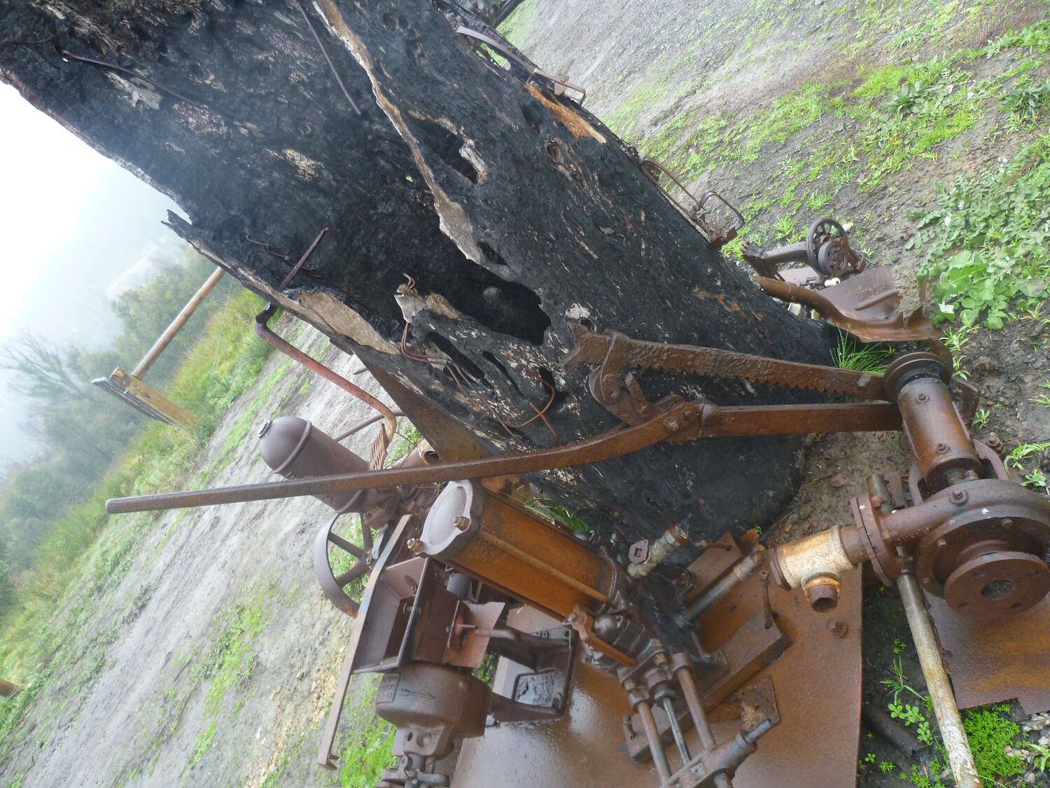 Large manual jack with long lever handle and a post with ratchets for lifting stumps or timber. The jack is burned and rusted.