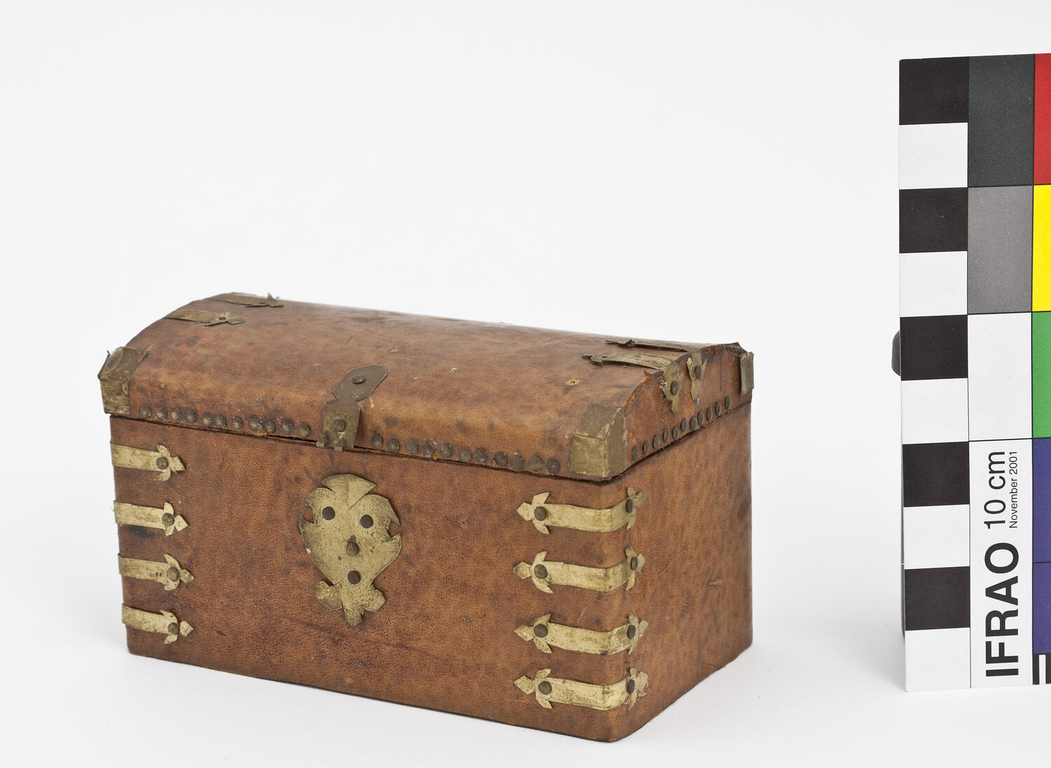 Wooden trunk with a slightly curved lid. Metal trim and studding on trunk. Piece of tartan ribbon inside trunk.