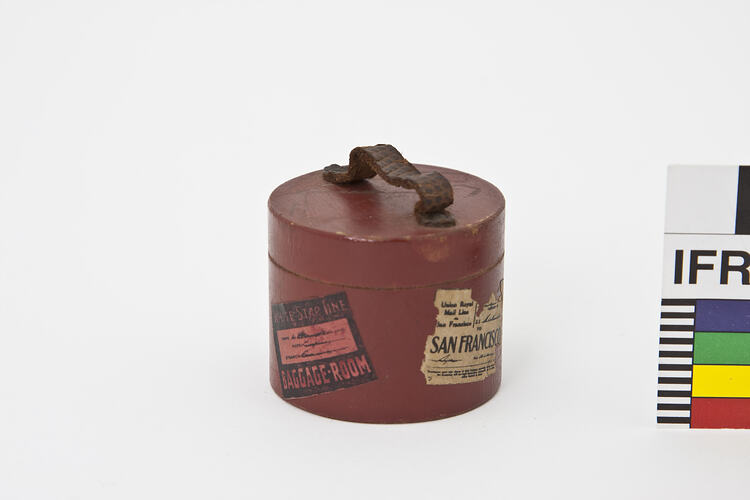 Hat box from Room 3 - Mr. & Mrs. Proudfoot's Bedroom, Basement, Central, Pendle Hall. From right of fireplace.