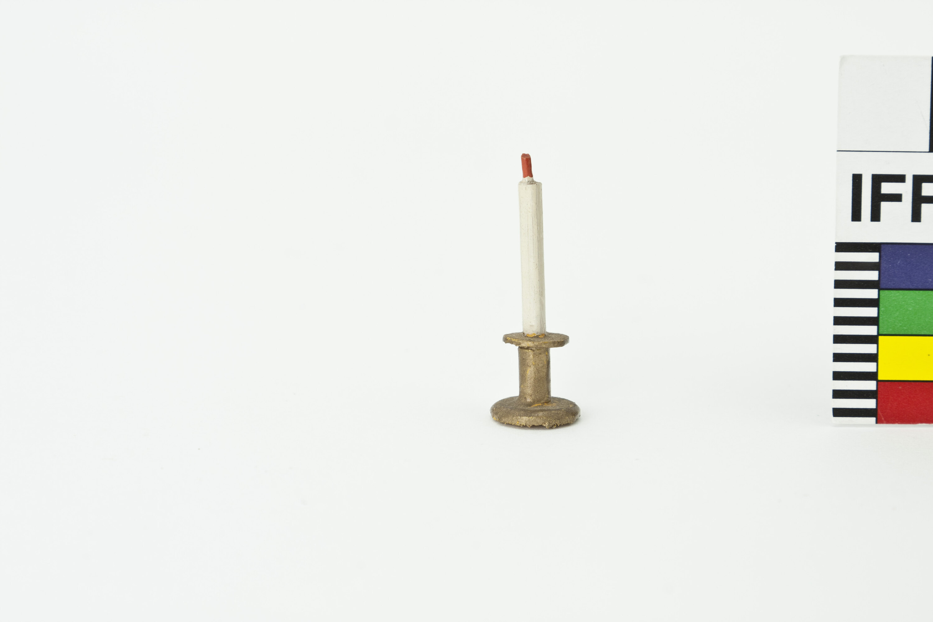 Turned, gold painted wooden candlestick with a white taper candle with a red wick.