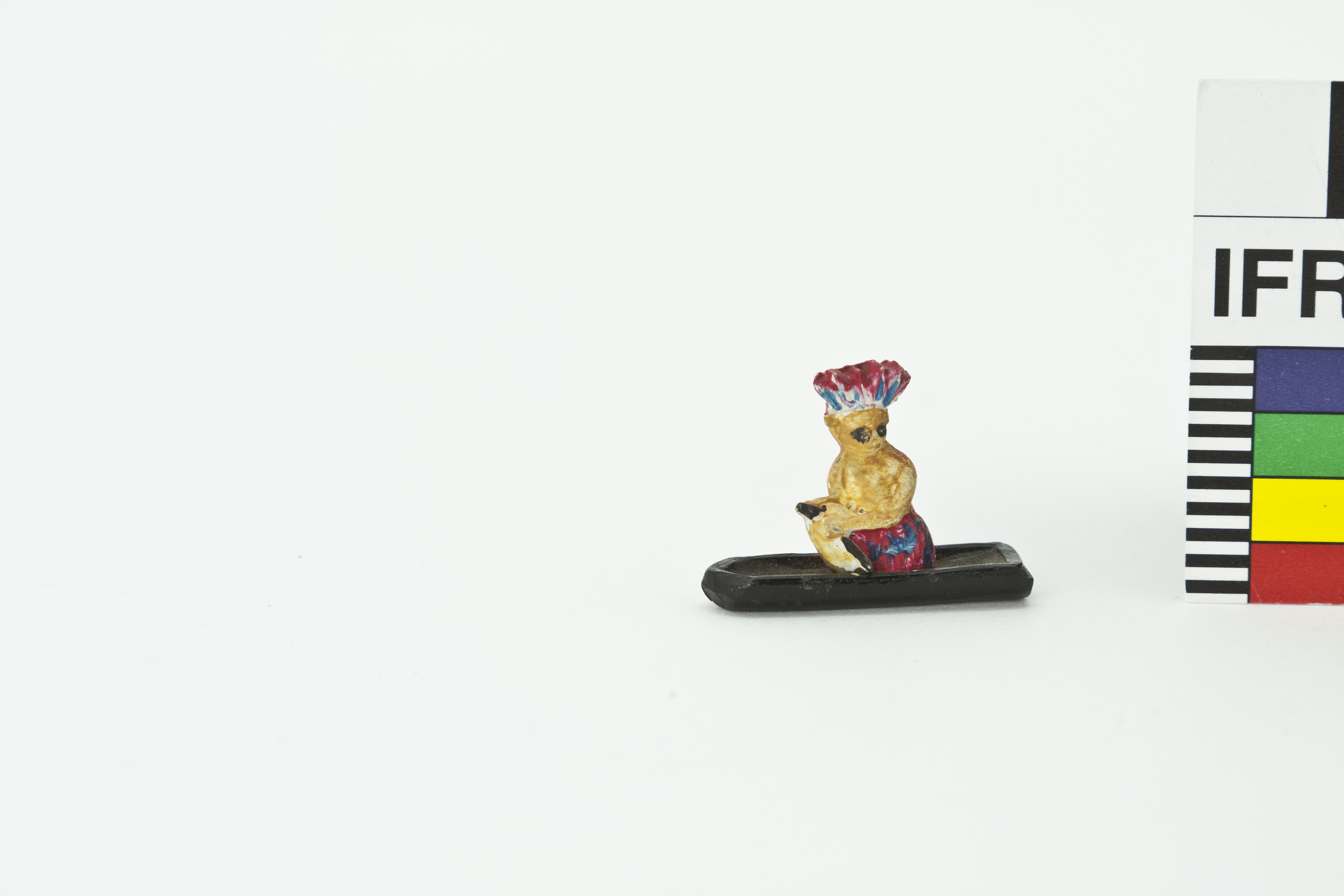 A native person in a black boat.