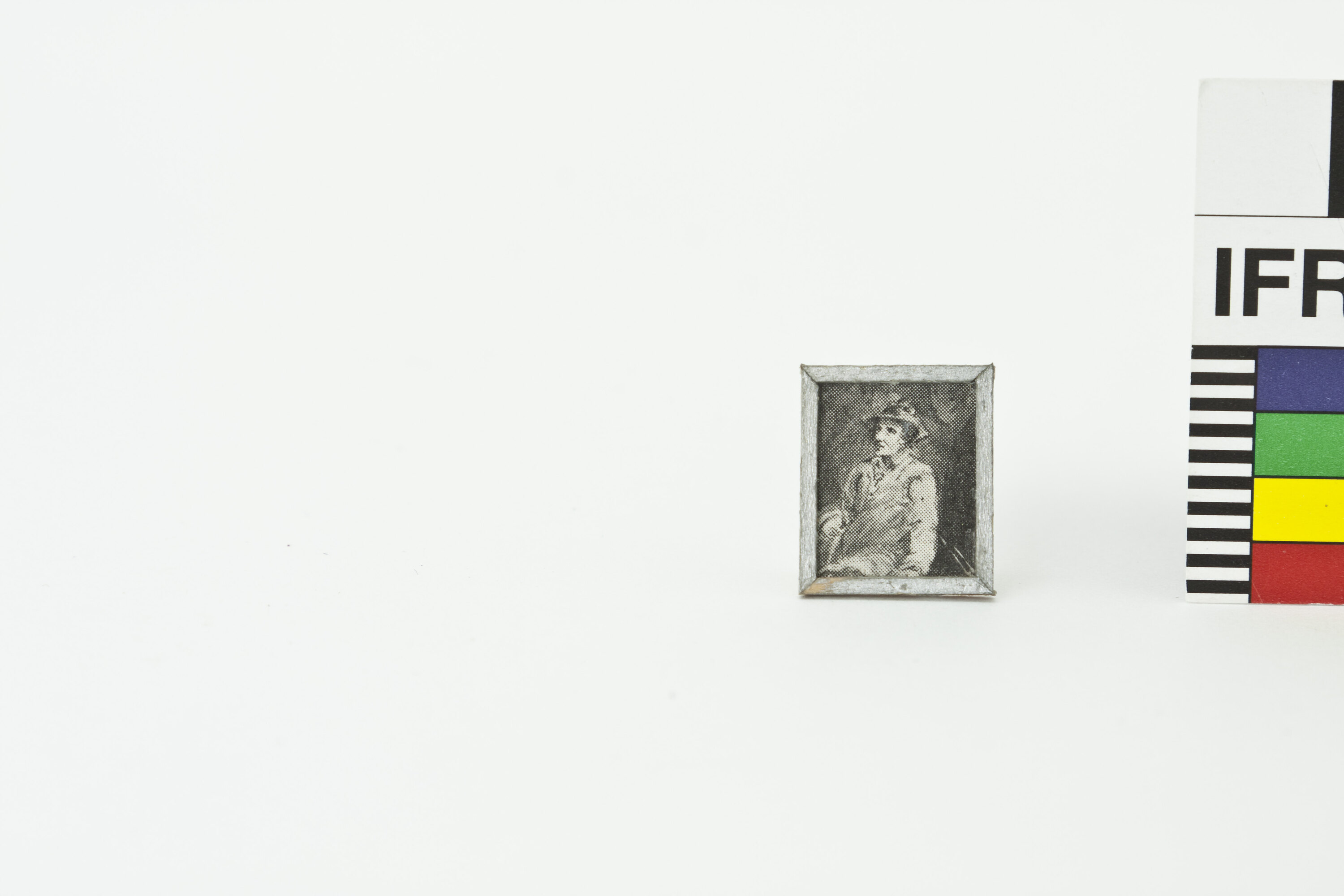 Black and white image of a woman in a silver frame.