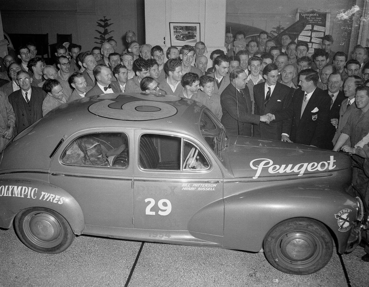 A group of men stand behind a Peugeot motor car inside the Melbourne Town Hall. Most are watching two men shake hands at the right.