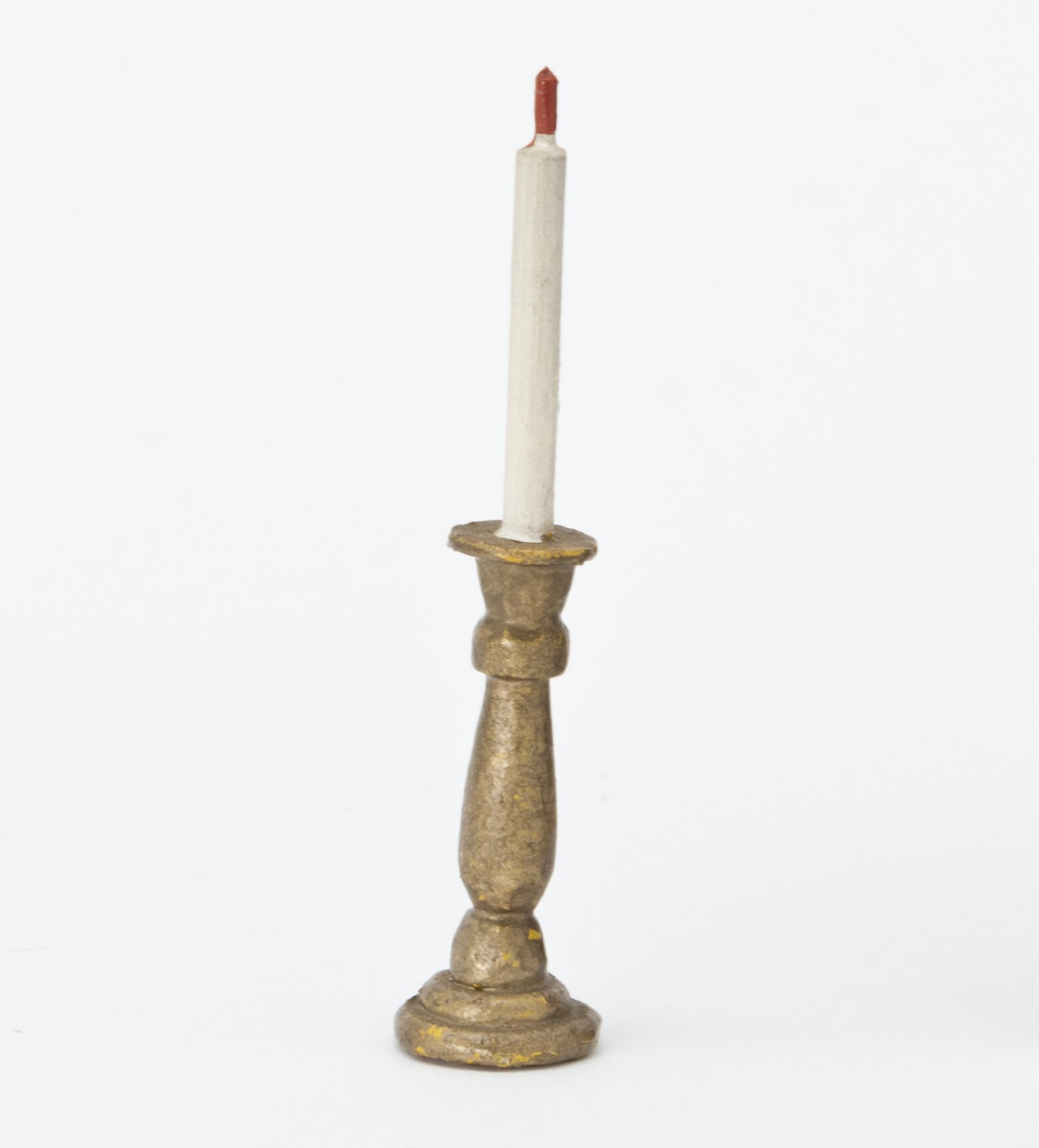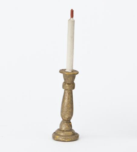 Turned, gold painted wooden candlestick with a white taper candle with red wick.