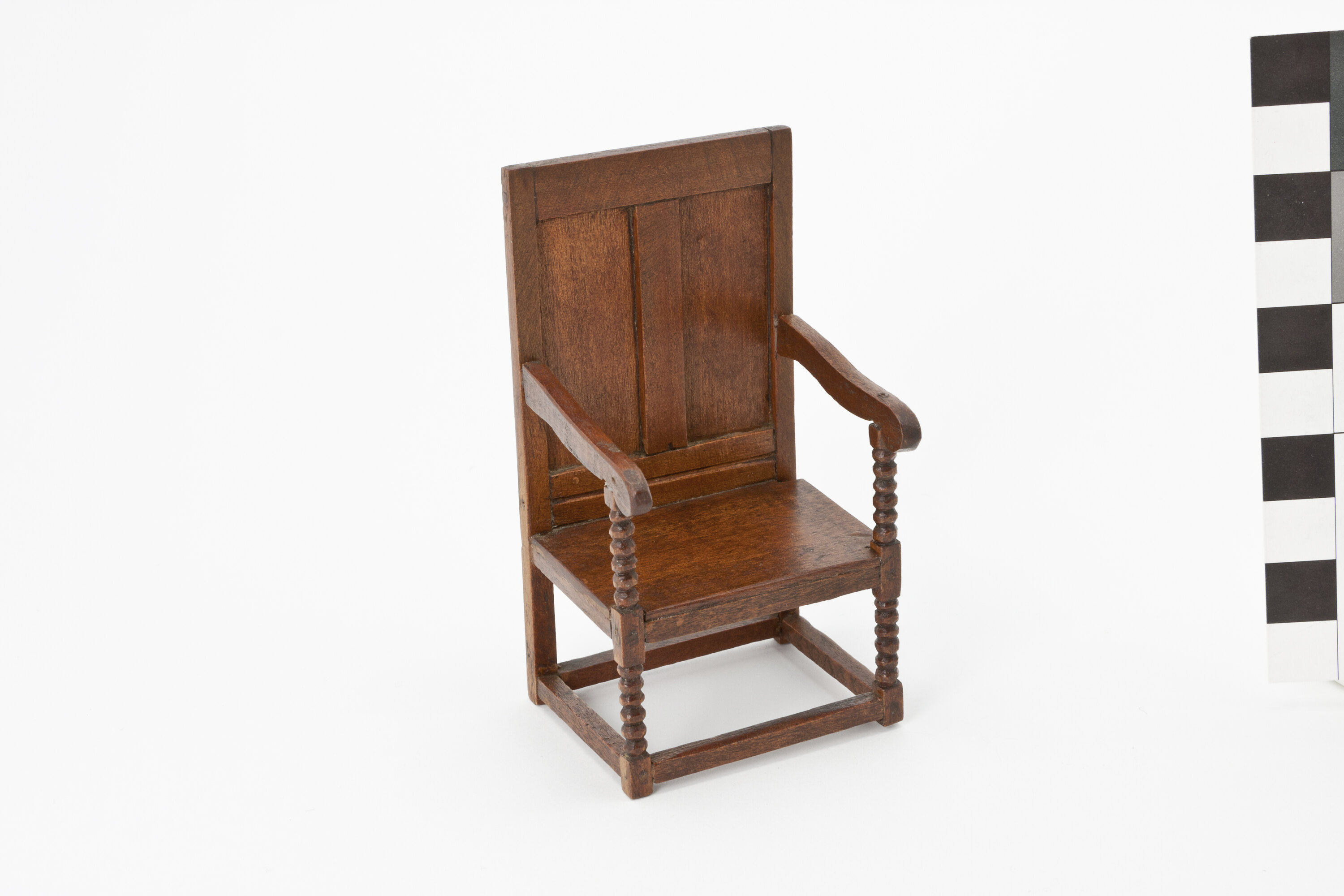 Wooden chair with two arms and turned legs.