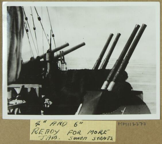 Handwritten in black ink underneath photograph: '4" AND 6' / READY FOR MORE / JAPS. SUNDA STRAITS'