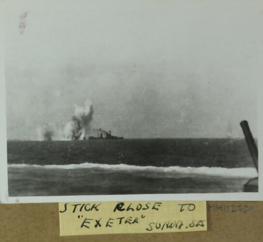 Imageb depicting the HMS Exeter 'under fire.' The term used in the inscription is 'stick' which is a slang term used to describe several bombs that are dropped either together or in immediate succession as opposed to a series. The HMAS Hobart served with the Exeter in February 1942 as part of the Eastern Striking Force, it is possible that this image dates to this time. The HMS Exeter was sunk on March 1, 1942.
