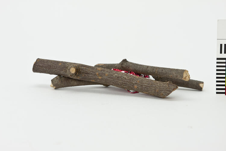 Three pieces of wood and some red silver foil.