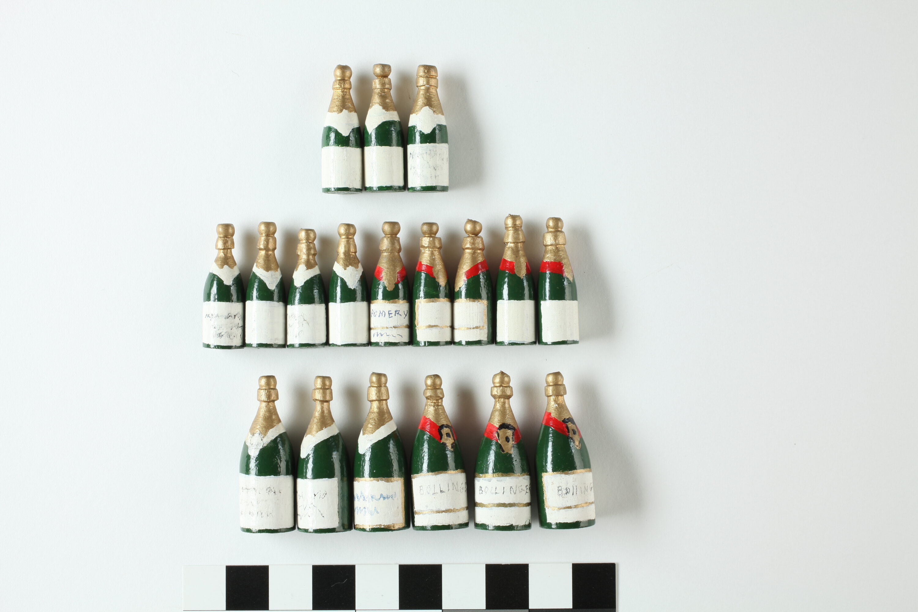 Eighteen bottles painted green with white labels. Eight bottles have red neck labels, ten bottles have white neck labels. All bottles have gold painted tops. All bottles are made of wood.