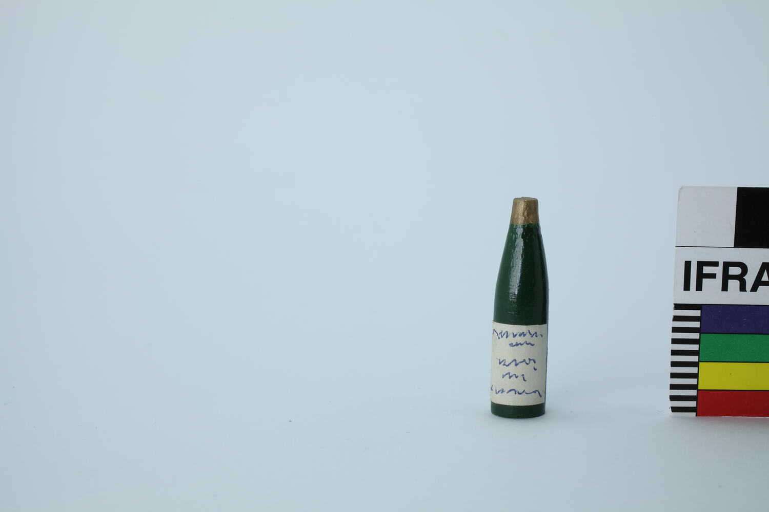 Green wooden bottle with gold lid and white label.