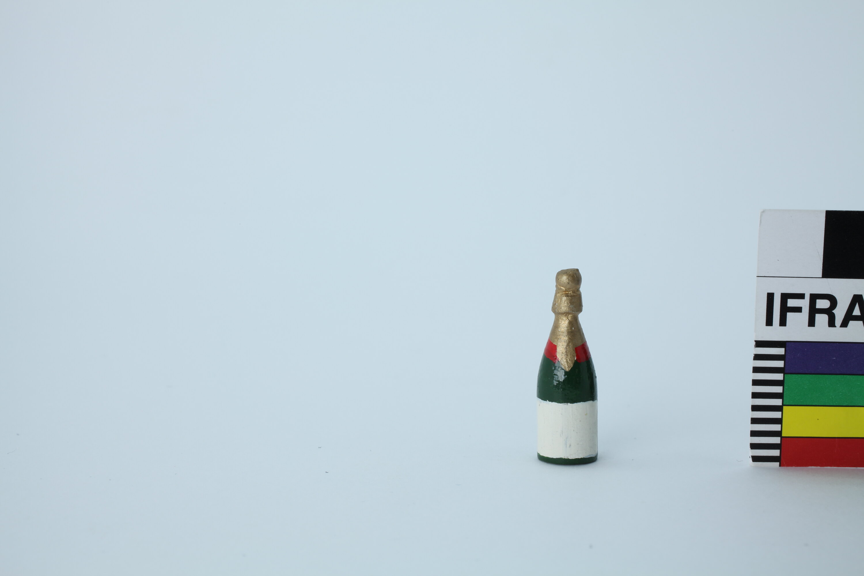 Green wooden champagne bottle with gold lid, white label and red neck band.