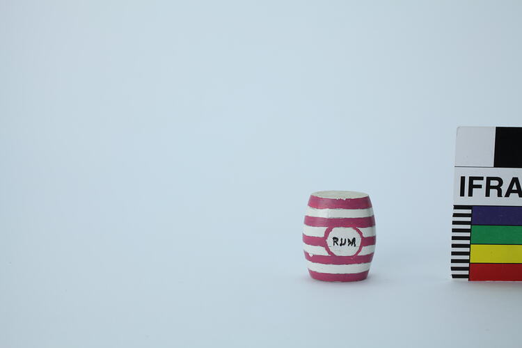 Painted wooden jar with pink and white stripes and black text.