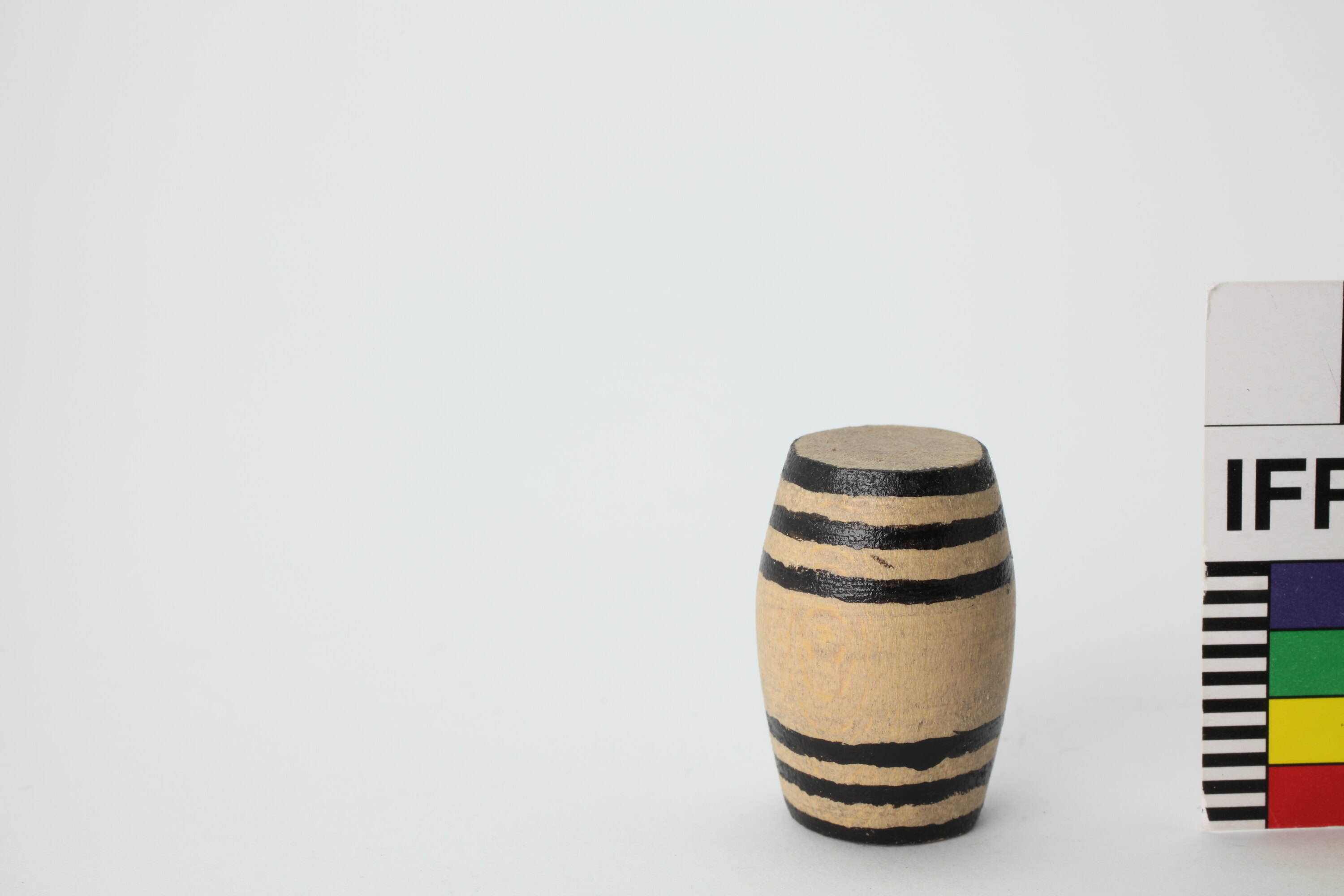 Round wooden barrel. Three black bands at top and bottom of barrel.