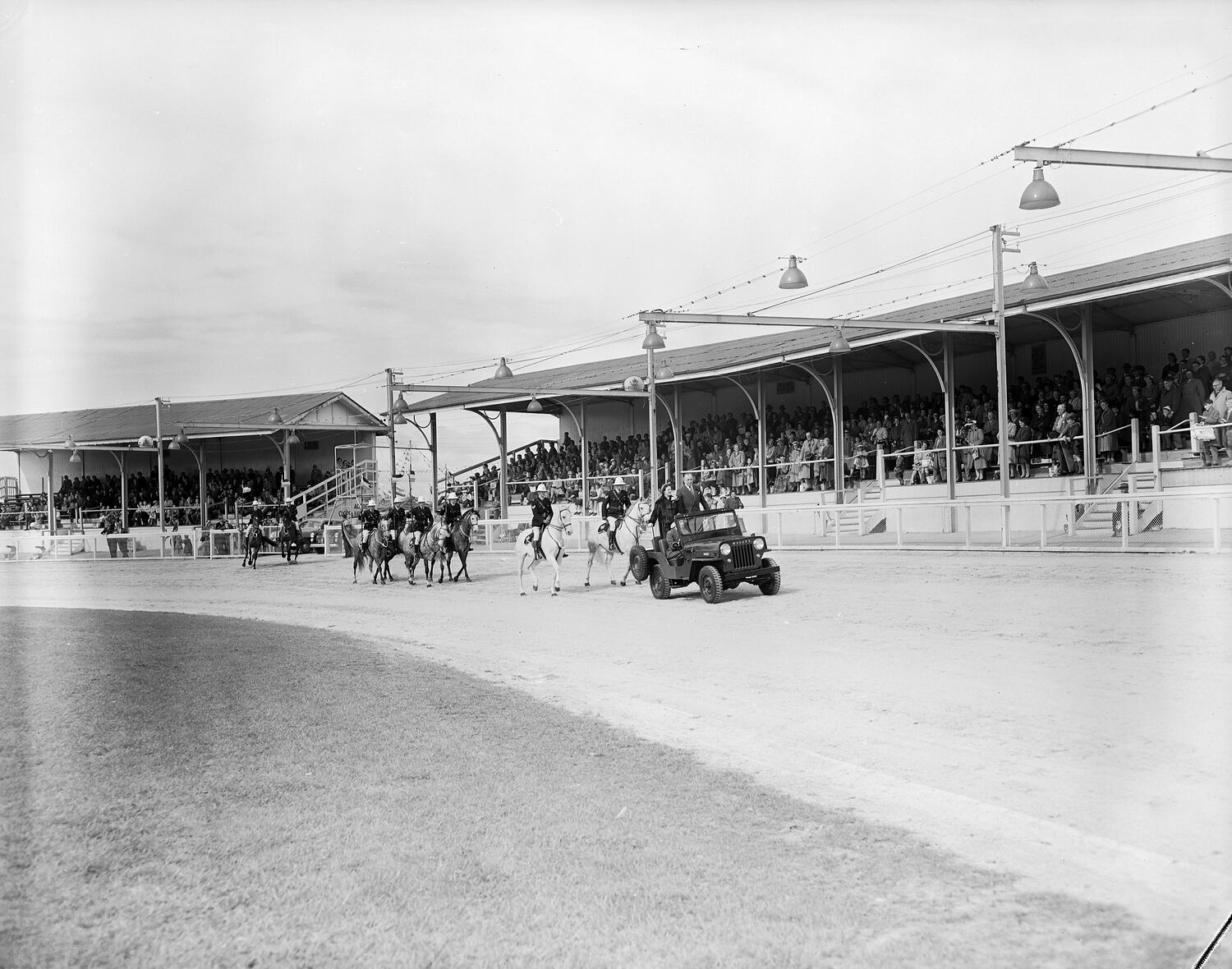 Procession on the showgrounds at the Royal Melbourne Show, picturing a man and woman in a Willys Jeep followed by men in uniforms on horseback. Crowds are pictured in the grandstands in the background.