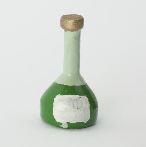 Wooden bottle with dark green painted base, light green neck, gold top and white label.